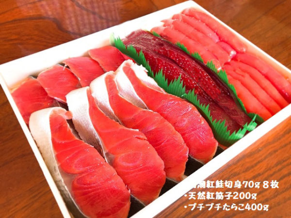 鮭切身と厳選された極上すじこと極上たらこの詰合せセットです。ゴルフコンペの賞品にも御好評頂いております。